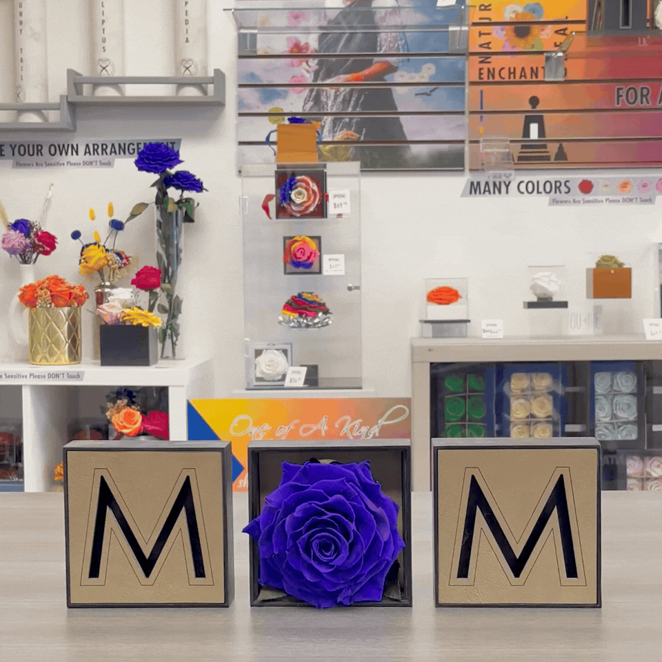 This luxurious three-piece set features wooden square boxes that spell out MOM, with the letter O adorned by a stunning, long-lasting rose.